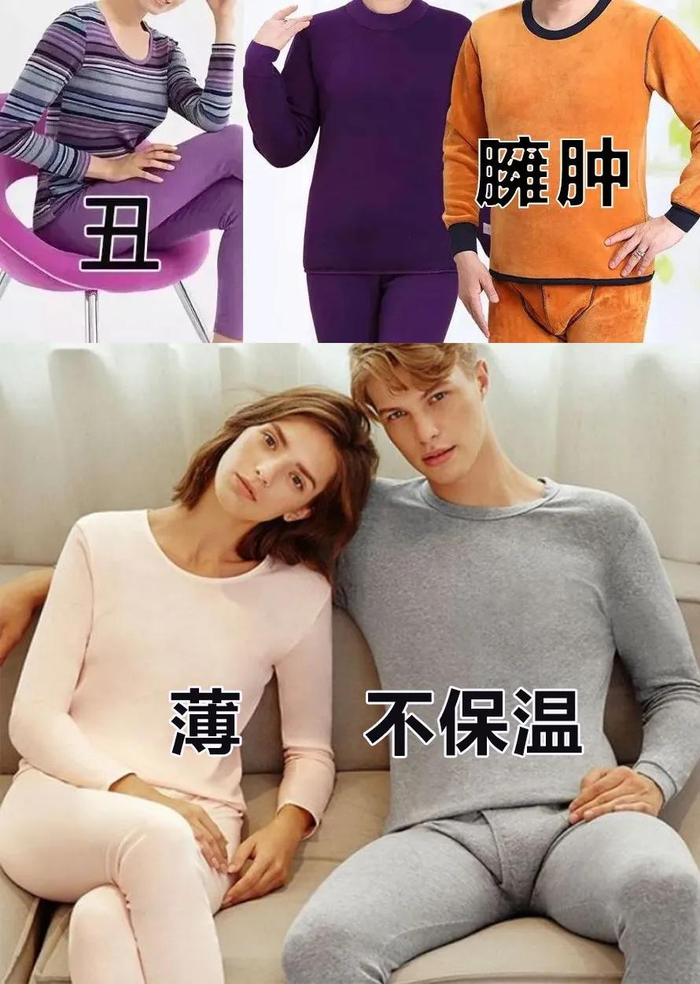 就好比全棉的秋衣裤,弹性差,会穿出胳膊肘和膝盖的「鼓包」,多洗几次容易缩水变硬。
