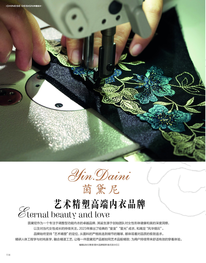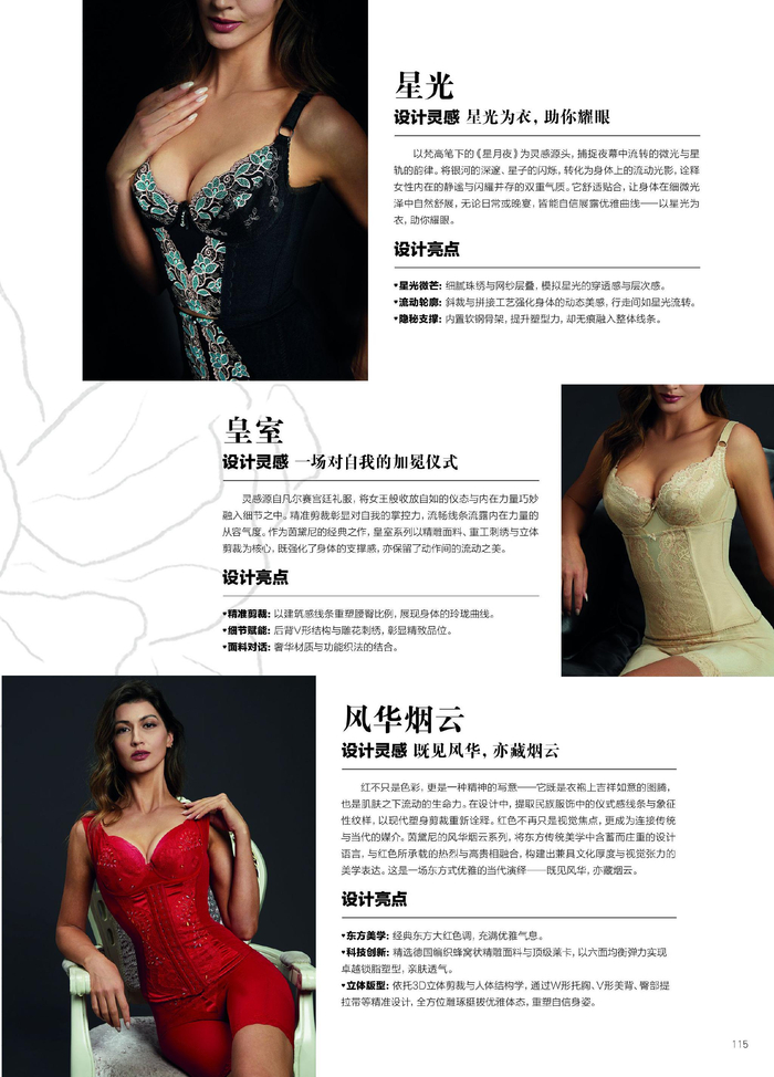 茵黛尼作为一个专注于调整型功能内衣的卓越品牌,其诞生源于创始团队对女性形体健康和美的深度洞察, 以及对当代女性成长的持续关注。2023年推出了经典的“皇室”、“星光”成衣,和高定“风华烟云”。其中“星光”以梵高笔下的《星月夜》为灵感源头,捕捉夜幕中流转的微光与星轨的韵律,诠释女性内在的静谧与闪耀并存的双重气质。“皇室”的灵感则源自凡尔赛宫廷礼服,将女王般收放自如的仪态与内在力量巧妙融入细节之中。精准剪裁彰显对自我的掌控力,流畅线条流露内在力量的从容气度。而“风华烟云”是一种精神的写意。它既是族袍上吉祥如意的图腾,也是肌肤之下流动的生命力。将东方传统美学中含蓄而庄重的设计语言与红色所承载的热烈与高贵相融合,构建出兼具文化厚度与视觉张力的美学表达。
