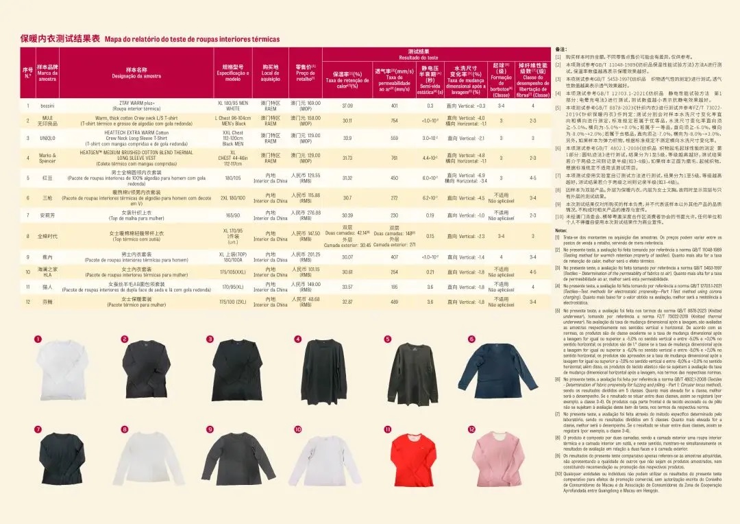 本次测试的保暖内衣样本分别由澳门消委会及合作区消协工作人员以一般消费者身份,从网上销售平台与线下实体店选购在包装标签或网页宣传中声称“保暖”或带有“保暖内衣”字样的产品。12款样本之中,8款由合作区消协于网上购买,4款由澳门消委会于澳门线下实体店购买。品牌方面,包括有bossini、MUJI 无印良品、UNIQLO、Marks & Spencer、红豆、三枪、安莉芳、全棉时代、蕉内、海澜之家HLA、猫人、芬腾,零售价由每件48.68元至276.88元人民币不等。